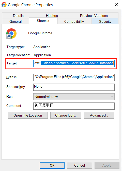 右击桌面上google chrome浏览器的快捷方式,点击属性,在目标项尾部添加 --disable-features=LockProfileCookieDatabase 参数,关闭浏览器并从桌面打开浏览器就行了,如下图。