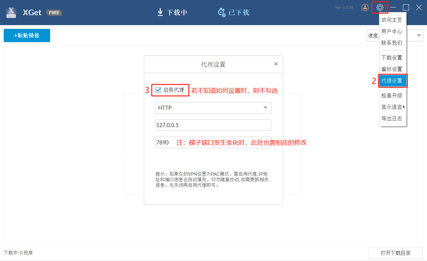 2.2 打开VideoXGet软件,点击"设置"菜单,再点击"代理设置"选项。设置科学上网工具提供的端口号,如若不知道设置请保持不启用状态。
