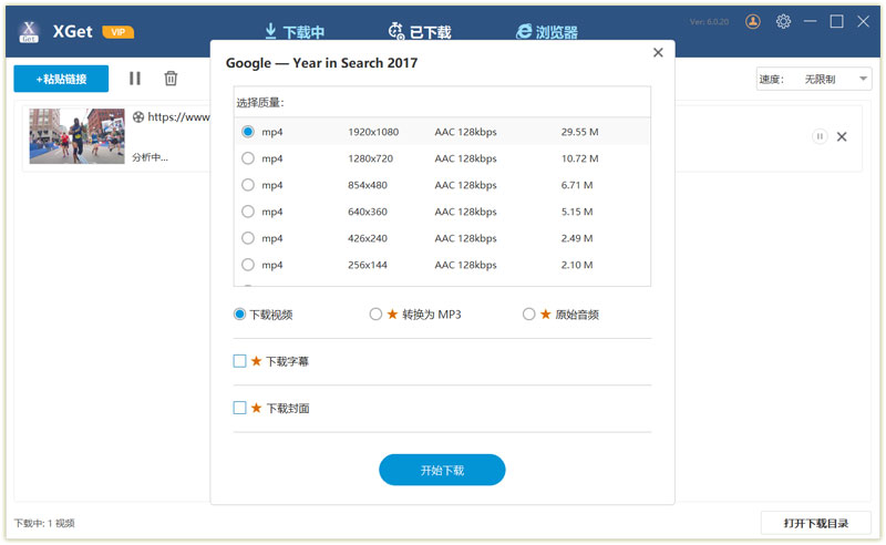 步骤3: 当完成解析后,软件会弹出分辨率选择框,此时选中想要下载的分辨率并点击 开始下载 按钮