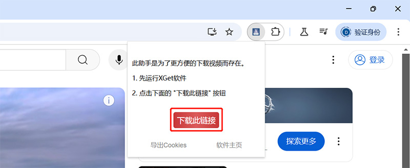 步骤6: 在浏览器打开需要下载的视频,点击XGet助手的 下载此链接 按钮可进行快捷下载; 点击 导出cookies 可以cookies文件导出为cookies.txt。