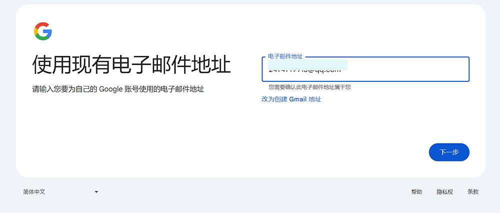 步骤4: 输入可用的邮箱,可以是QQ邮箱,也可以是gmail邮箱或其它,但一定是可用的且能收到验证码的邮箱。然后点下一步